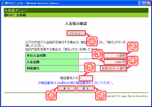 「メインメニュー」ボタン 入出金メインメニューに戻ります。 本日入金回数 本日の入金処理実行回数です。今回処理する分を含めた回数が表示されます。 入金金額 お客様が指定された入金金額です。 利用銀行 お客様がご利用の銀行(住信SBIネット銀行)を表示します。 暗証番号入力 JRA即PAT用の暗証番号を入力します。 「実行」ボタン 表記の内容で、入金処理を実行します。 「戻る」ボタン 前の入力画面に戻ります。