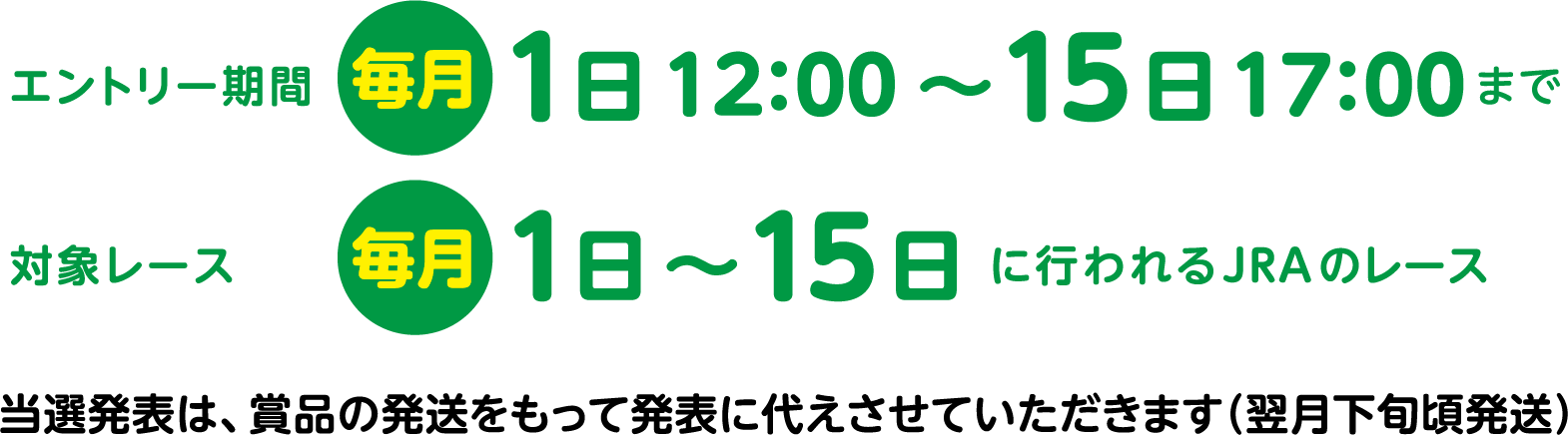本キャンペーンは、毎月抽選で賞品が当たる、JRA電話・インターネット投票会員様限定のプレゼントキャンペーンです。Club JRA-Netサイトでエントリー期間中にエントリーし、JRA電話・インターネット投票で応募月の応募参加条件(ミッション)をクリアする馬券をご購入いただくと抽選で賞品が当たります。エントリーは毎月1日12:00~15日17:00までです。(メンテナンスに伴い前後する場合がございます)応募方法